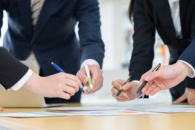 会議で指を指して説明する、カフェでカップを持つ、スマホを操作する。